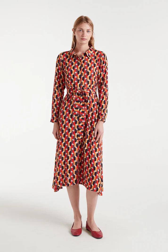 Abito midi fantasia. Collo con revers e maniche lunghe terminate con polsino abbottonato. Chiusura frontale con bottoni e cintura con fiocco. La modella è alta 179 cm e indossa la taglia S.