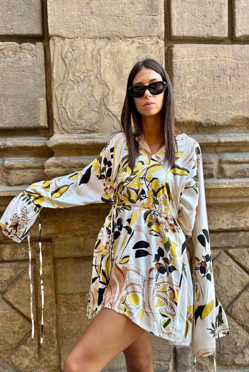 Abito Kimono GIADA Limited Edition, in morbido tessuto di viscosa 100%. stampa f;oreale autunnale sui toni del marrone, nero e giallo su fondo burro.