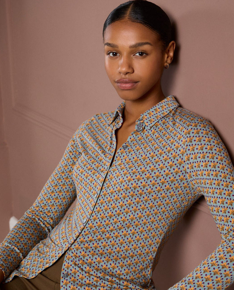 Camicia a maniche lunghe in morbida viscosa elasticizzata con un'affascinante microstampa rétro. Il taglio classico con collo a camicia la rende un capo versatile, comodo ed elegante, ideale per l'abbigliamento quotidiano.