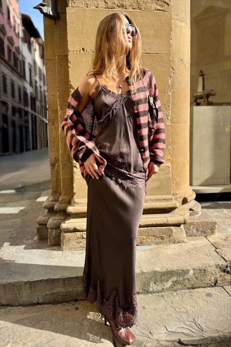 Canotta effetto raso, con fondo obliquo in pizzo.