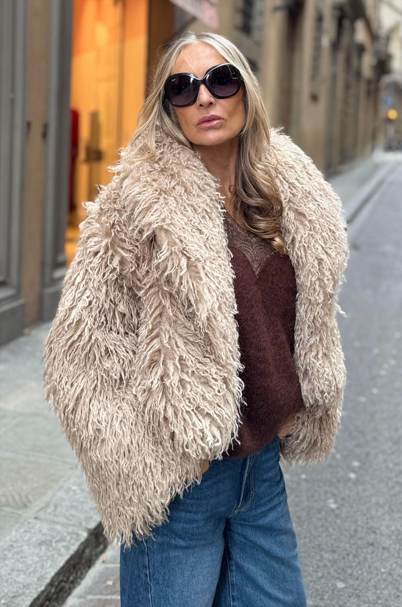 giacca corta in ecopelliccia Effetto momgolia. revers a scialle. poliestere