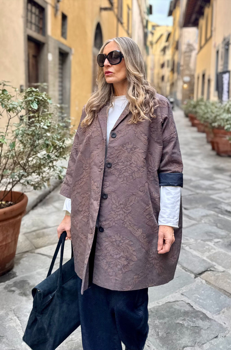 Realizzata in un pregiato tessuto effetto tappezzeria ricamato, dalla texture materica e sofisticata, che dona carattere anche agli outfit più essenziali.