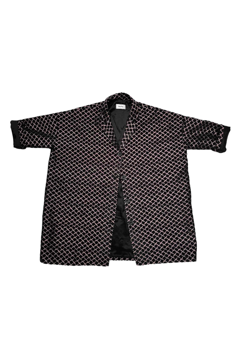 giacca kimono limited edtion in tessuto operato: piccoli quadrettini neri in velluto su fondo rosato cangiante.