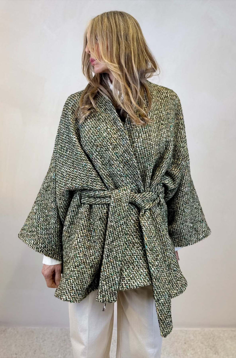 la giacca Kyoto reinterpreta il kimono in chiave contemporanea, con linee essenziali e volumi avvolgenti. La silhouette è valorizzata dalla cintura in vita, che permette di regolare il fit mantenendo un’eleganza naturale.