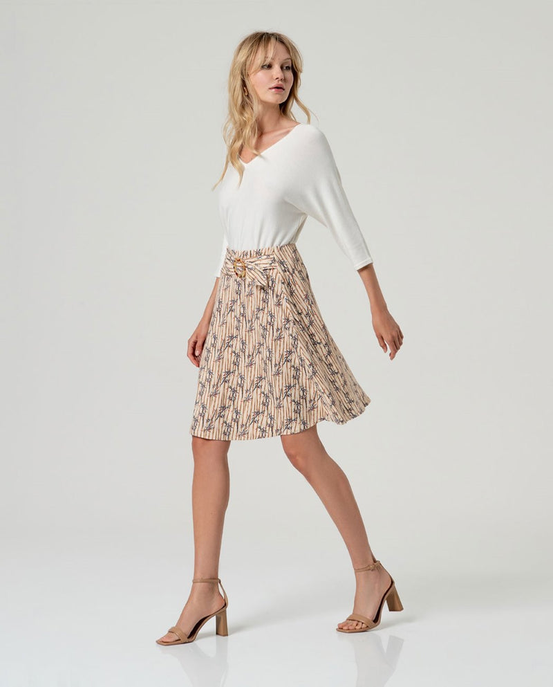Gonna di media altezza fino al ginocchio con cintura fissa e chiusura laterale. Design leggermente svasato con stampa geometrica continua e dettagli di fibbia in vita. Realizzato in tessuto leggero con viscosa ed elastano EcoVero.